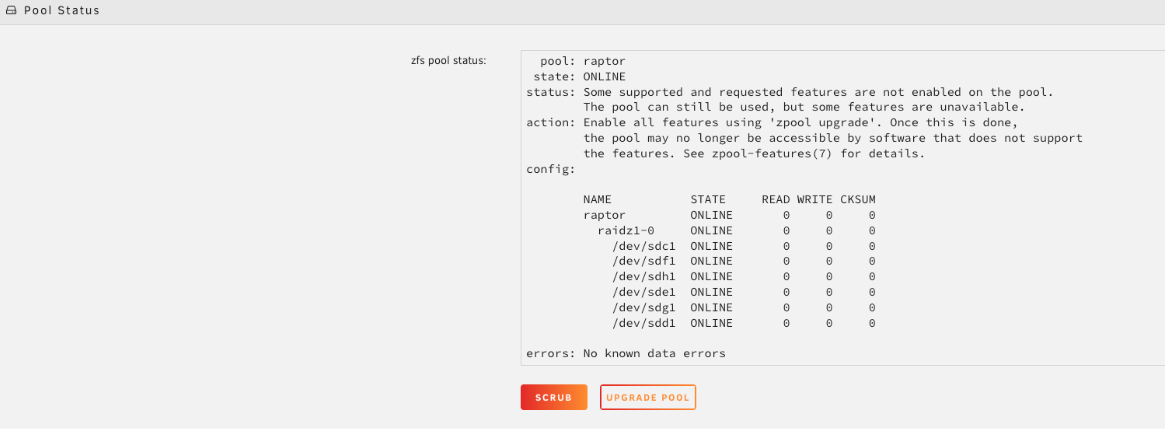 raptor) to open its configuration. - Under Pool Status, check the status and click Scrub.
