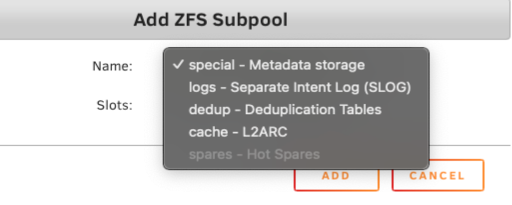 Unraid refers to ZFS support vdevs as subpools. Most users do not need these, but advanced users may encounter them: