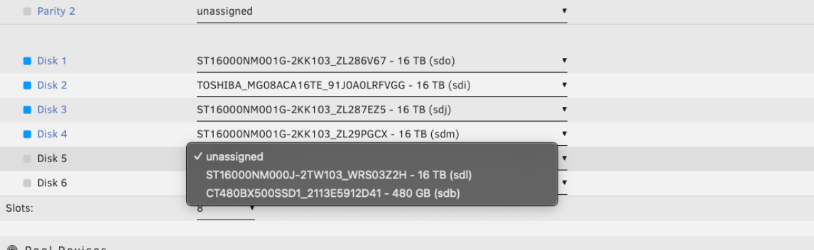 当将 ZFS 池导入到 Unraid 时,您需要指定原始池中的每个驱动器,包括用于支持 vdevs 的驱动器,确保将其分配到池槽中。Unraid 将在 array 启动后自动识别每个驱动器的角色(数据、日志、缓存、特殊或去重)。您不需要手动指定每个驱动器的用途。
